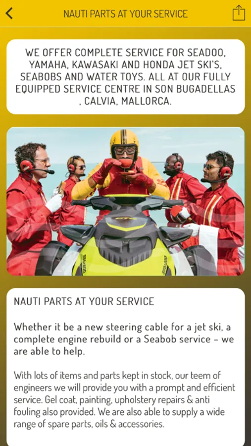 MÁS DE 25 AÑOS NAUTI PARTS EN MALLORCA: Fundada en 1995 Nauti-Parts ha sido, desde entonces, la principal compañía dedicada a los deportes acuáticos y deportes extremos. Es el distribuidor oficial y único de Seadoo Bombardier en Mallorca, contando con las ventajas y servicios de un distribuidor oficial.
