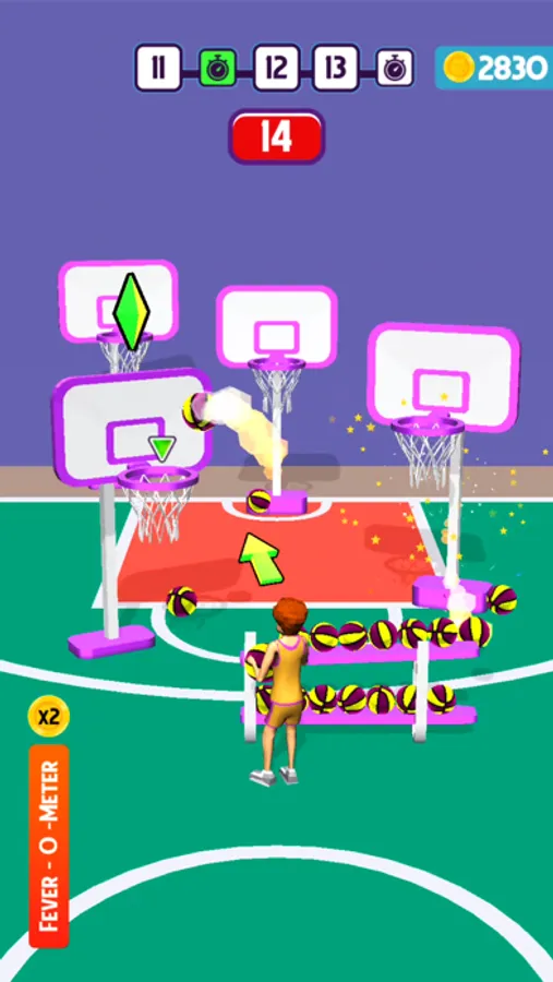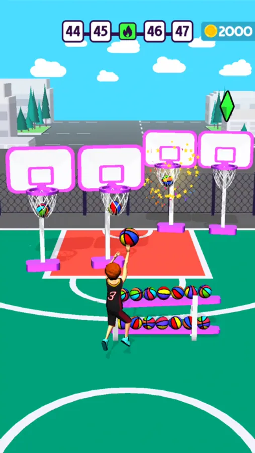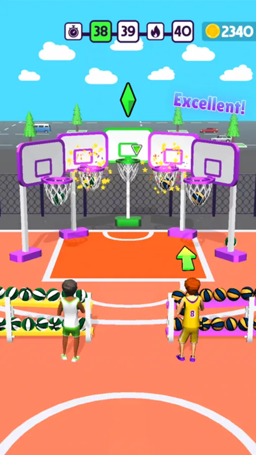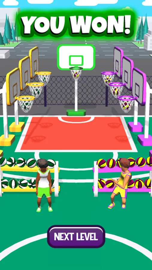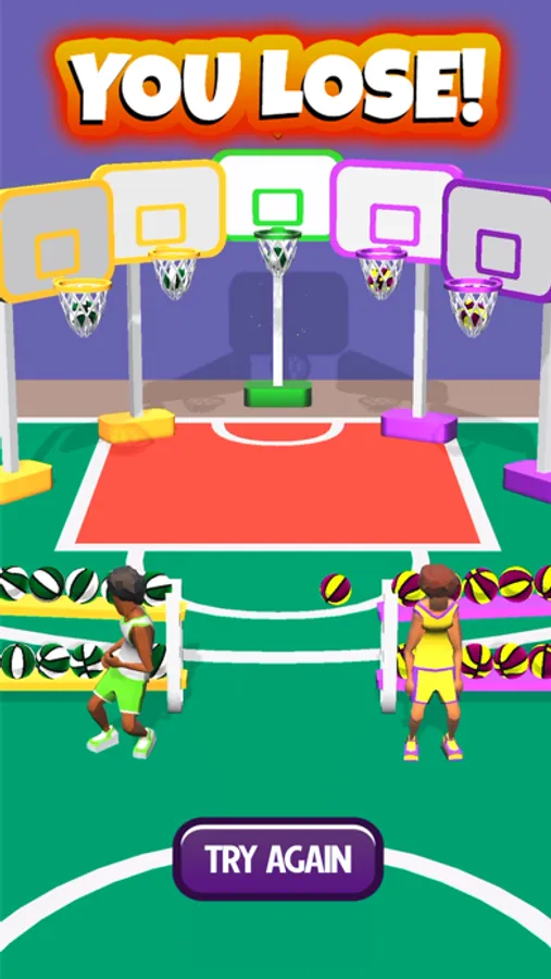 Shoot the baskets and try to block your opponent's shots before your opponent finishes shooting the baskets.