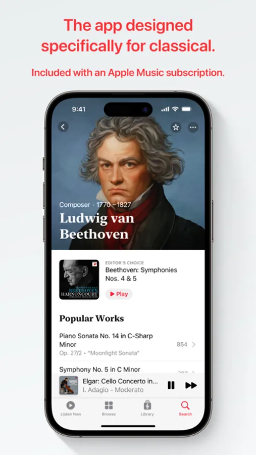 Get the app designed specifically for classical music. Available to Apple Music subscribers at no additional cost. Instantly find any recording in the world’s largest classical music catalog with search built for the genre. Enjoy the highest audio quality available (up to 192 kHz/24-bit Hi-Res Lossless) and hear classical favorites like never before in spatial audio, all with zero ads.