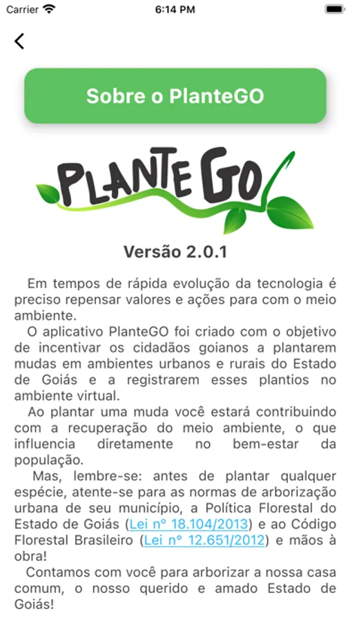O aplicativo PlanteGO foi criado com o objetivo de incentivar os cidadãos goianos a plantar mudas em ambientes urbanos e rurais do Estado de Goiás e a registrarem esses plantios no ambiente virtual.