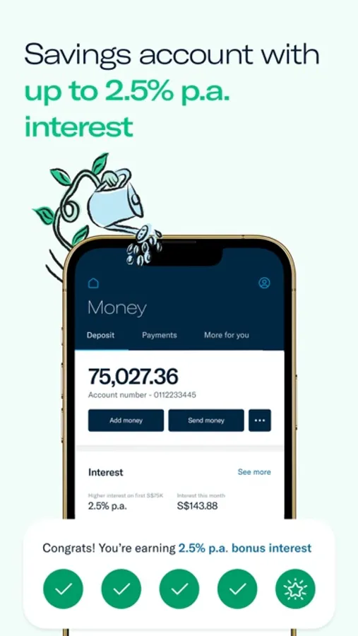 Earn up to 2.5% p.a. interest on the first S$125,000 deposit. Plus, enjoy additional savings of up to 11% on groceries and food at FairPrice Group with our debit card. Terms and conditions apply. Insured up to S$75k by SDIC.