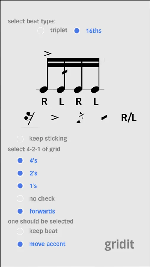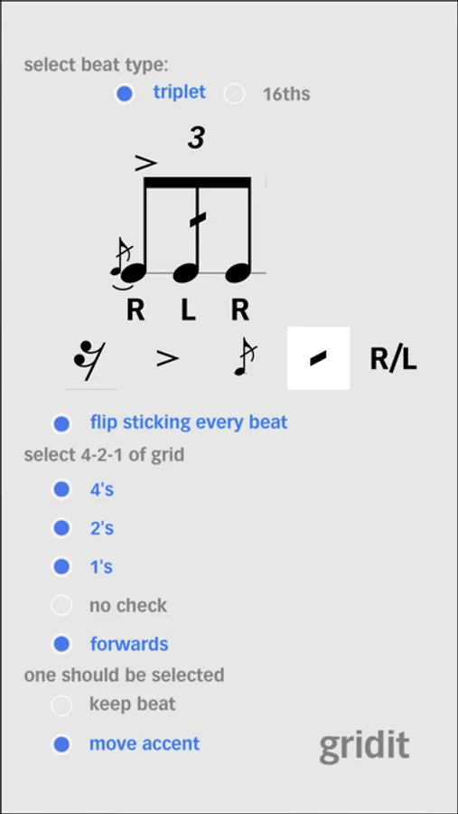 You've been taught this at every drum camp you've attended. You even wrote out some just to get your mind around it. Now have an app in your hands to create the grid of your own choosing. 4-2-1 style. move the accent. move the beat. triplets or sixteenths. forwards, backwards. change the sticking.