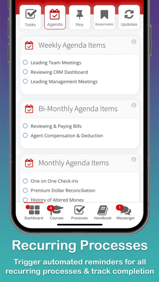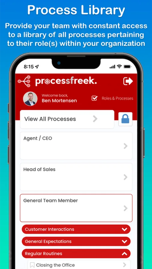Activate #BOSSMODE in your organization with ProcessFreek. Onboard employees from anywhere. Provide intuitive training courses customized for your organization, complete with chapter quizzes. Improve consistency by compiling all system and process documentation into a single location (for simple viewing) in both paragraph and/or video form. Reinforce compliance to processes by setting a recurring schedule for each one, which puts a reminder in front of the right person, at the right time. Coach your team members to compliance with processes by leaning on a robust reporting system within ProcessFreek that allows you to review completion ratios of recurring processes. Master task management with one-time agenda items, and improve overall communication within the messenger feature of the app.