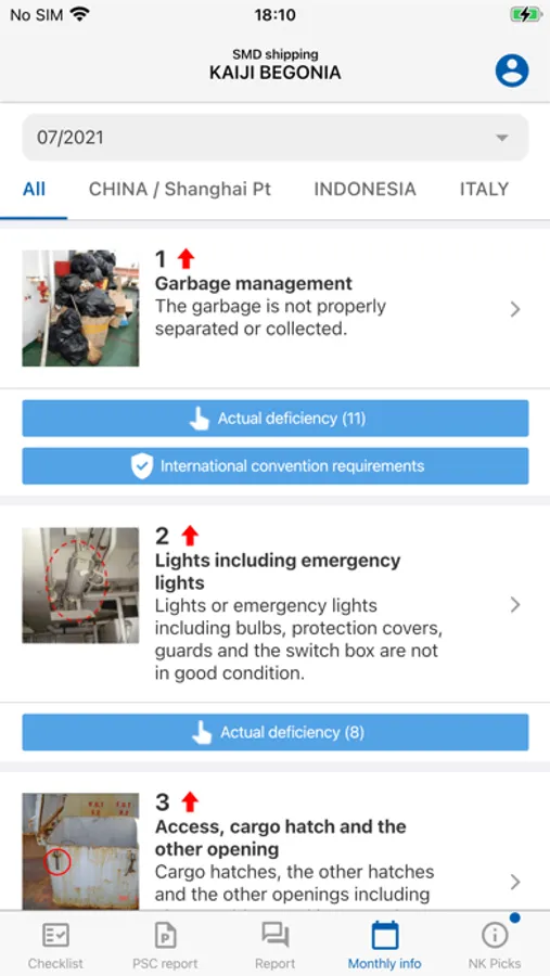 This function shows the top 10 typical deficiencies with their transition chart and actual deficiencies and photographs for the past month in each country or port set by the user.