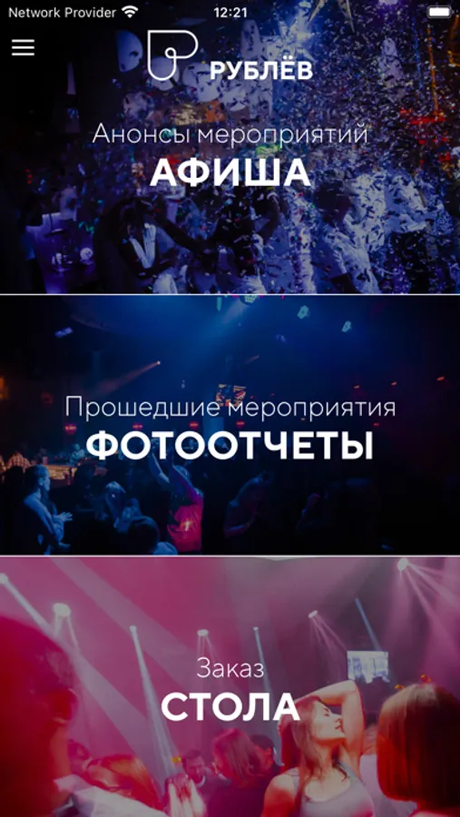 Приложение ночного клуба «Рублёв» позволяет оформить заявку на бронь столов. Следите за афишами мероприятий, а так же смотрите все фотоотчеты с вечеринок!