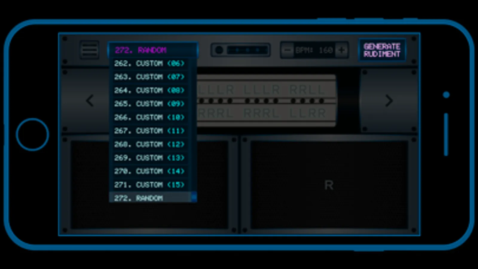 - Random rudiment generator capable of producing endless unique patterns at the touch of a button