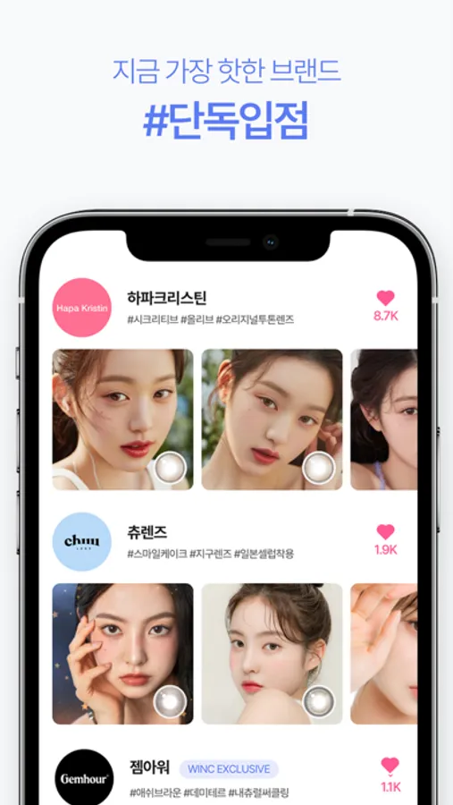 - 인기 렌즈 : 윙크 독점 브랜드의 인기 상품을 한눈에 볼 수 있어요.