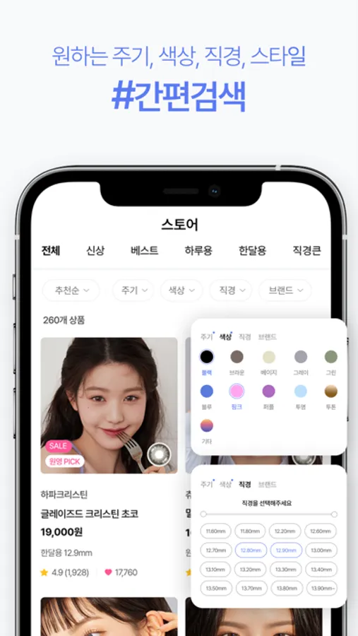 - 상품 검색 : 주기, 컬러, 직경. 내가 원하는 상품을 편리하게 찾을 수 있어요.