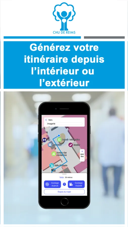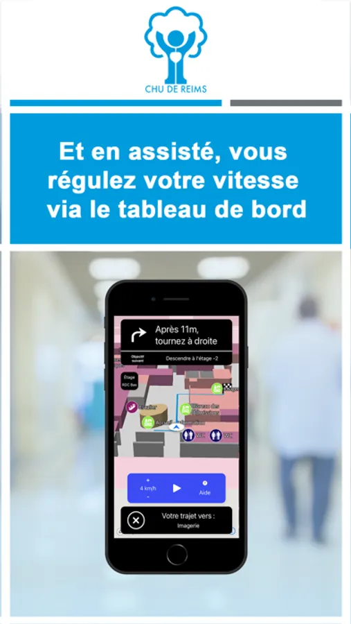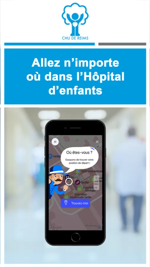 L’application de géoguidage du CHU de Reims (Centre Hospitalier Universitaire de Reims), est donc votre guide dans l’Hôpital d'enfants. Si vous ne savez pas comment vous rendre dans un service, GeHop vous y guidera depuis n’importe où, dans ou en dehors de l’établissement. Une fois à l’intérieur, n’hésitez pas à scanner un QR code pour lancer l’application, définir votre itinéraire et atteindre votre destination. Et si vous ne trouvez pas votre destination dans la liste, recherchez-la et GeHop vous proposera le synonyme de son nom. Par la suite, vous pourrez aussi sélectionner l’itinéraire avec et/ou sans ascenseur.