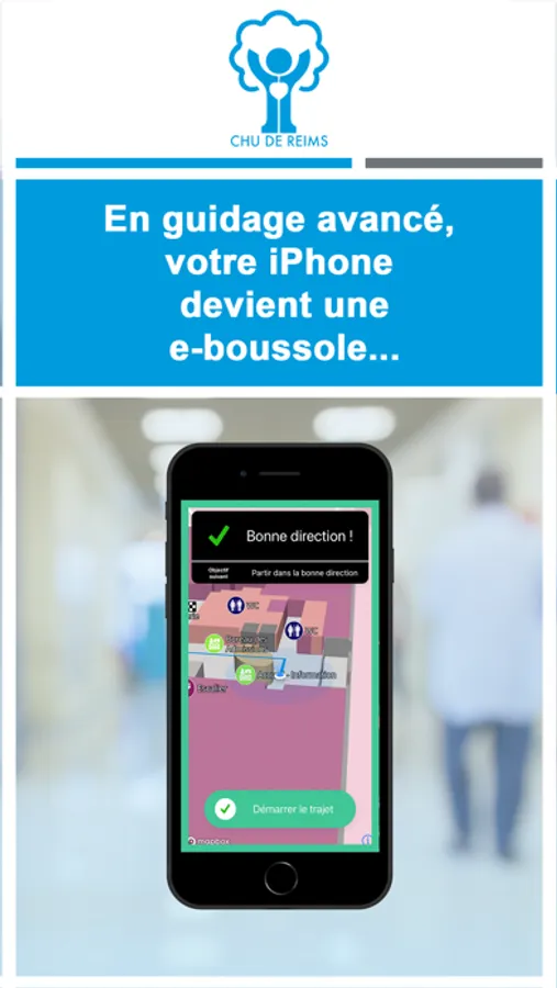 Ainsi, si vous êtes perdus dans le CHU de Reims, flashez un QR code, ouvrez le lien dans GeHop, ou, cliquez sur “Trouvez-moi” et l’aventurier vous aidera à définir votre itinéraire en fonction de vos options (mode de guidage et ascenseurs ou escaliers). Il ne vous restera plus qu’à suivre les instructions de l’aventurier. En fonction de l’état des capteurs de votre téléphone et de vos autorisations, certaines actions vous seront peut-être demandées.