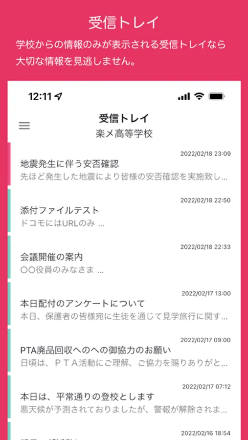 学校から送られてくる保護者や生徒への連絡をこのアプリで受信することができます。またメッセージの保管や不要なものを削除することができるほか、スマートフォンの機種変更をした場合には、データ移行は不要で新しい機種でも利用を再開すれば過去メッセージを再度取得することができます。