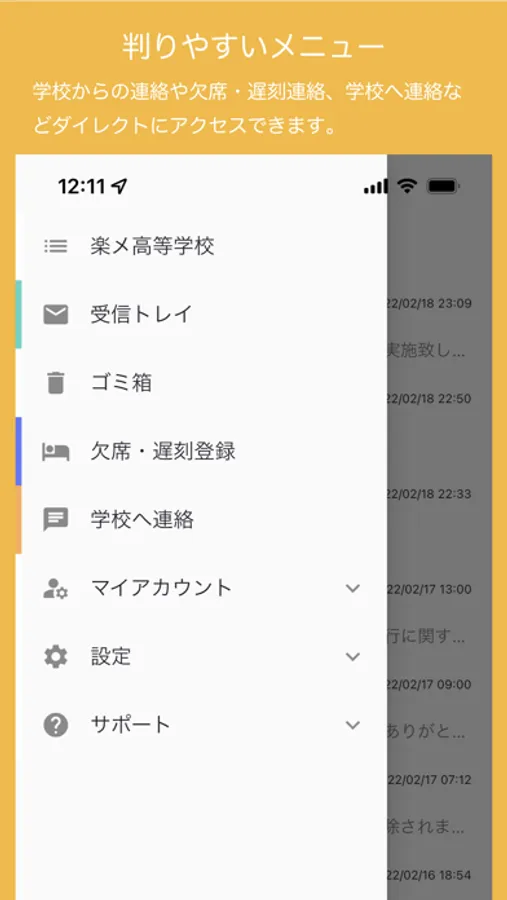 以上2点が満たされた場合に、ラクメアプリを利用して学校から通知を受けたり、欠席・遅刻連絡などアプリ経由で学校へ連絡することができます。