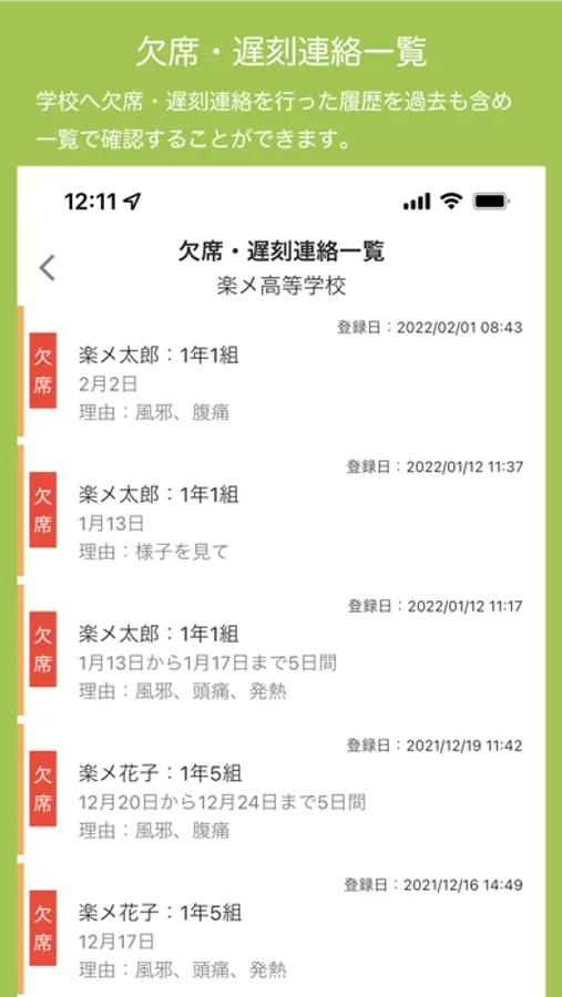 ※この機能を利用するには、学校側が欠席・遅刻連絡を設定していることが前提になります。なお、生徒からの登録は学校が設定を許可していない場合は利用することはできません。