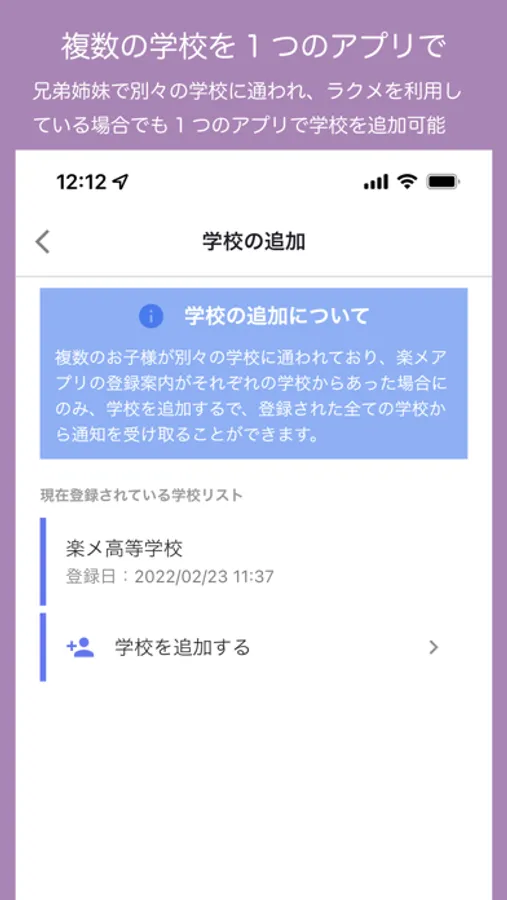 兄弟が別々の学校に通っている場合、複数の学校を登録して、1つのアプリの中で情報を確認することができます。