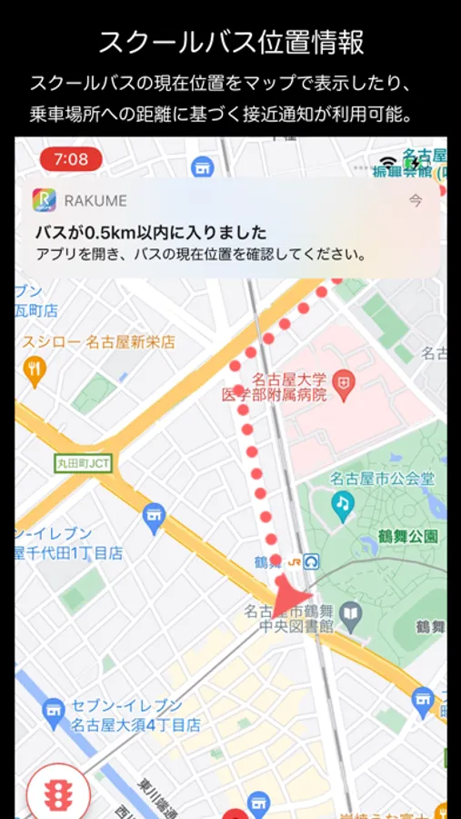 スクールバスが運行中の場合に、バスの走行位置をマップに表示したり、乗車される方の場所までの距離による接近通知を受けることができます。
