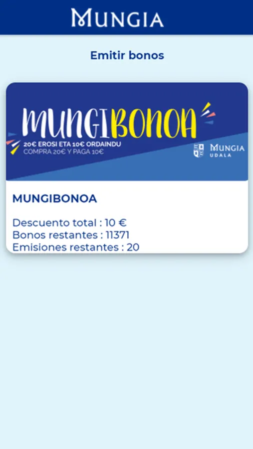 Aplicación para la emisión y gestión de los diferentes bonos ciudadanos ofrecidos por el Ayuntamiento de Mungia, desde esta app los comercios podrán emitir y validar bonos para los usuarios, adjuntar tickets de compra y subir otro tipo de documentos requeridos por el ayuntamiento.