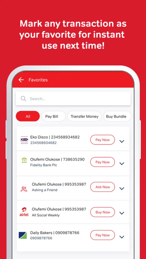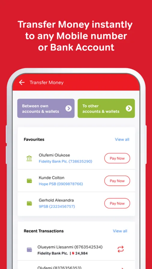 - Transfer Money instantly to any mobile number or Bank accounts.