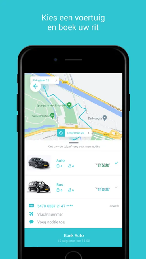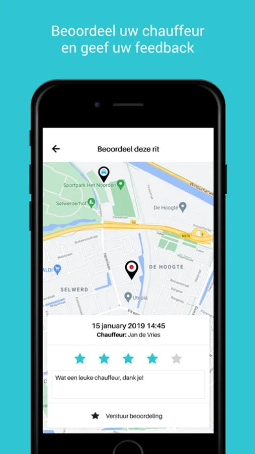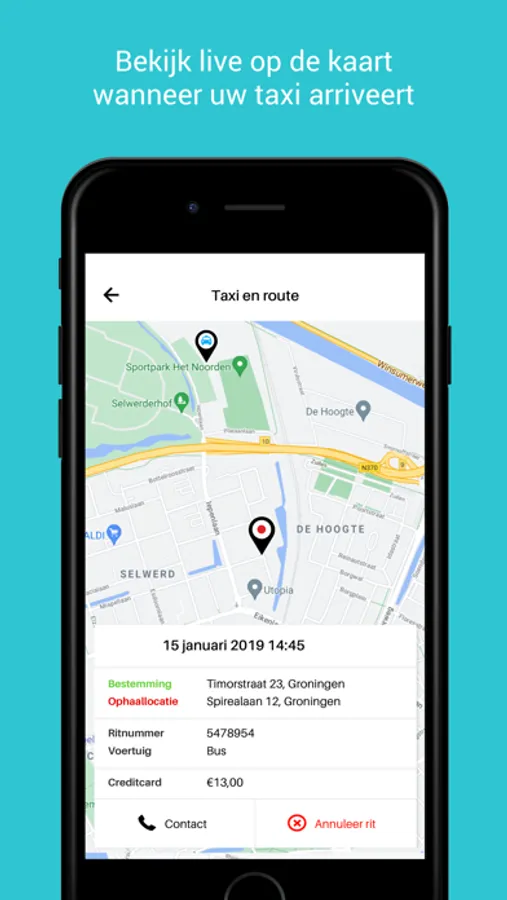 De GPS in je smartphone weet direct waar je staat, dus bestellen is zeer eenvoudig. Je kunt de reservering zelf beheren en eventueel wijzigen in de app. Omdat je de taxi kunt volgen op de kaart, weet je precies wanneer deze voor de deur staat en hoef je dus nooit meer onnodig te wachten! Inloggen doe je eenvoudig met je social media account, of je vult gewoon je gegevens in. Extra handig: sla je thuisadres op als favoriet!