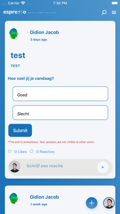 Espresso is a data storytelling platform that enables you to share information within your organisation or teams/groups in no time. Different kind of posts can be created by content creators within your teams, from images to graphs and polls and shared across the platform on different channels. Users can awlays interact with each other underneath the posts by reacting or commenting. This way of sharing information within your organisation allows you to bring your data to life instead of sending endless amount of emails with spreadsheets that eventually always end up in the bin.