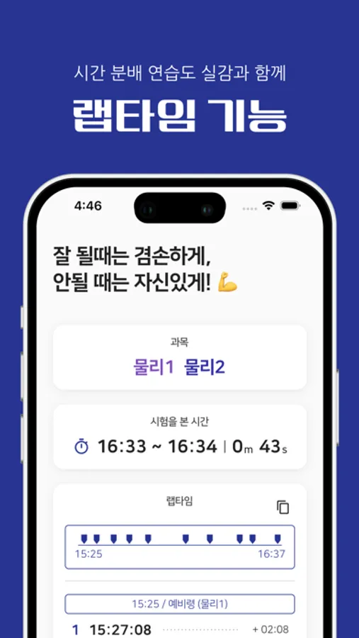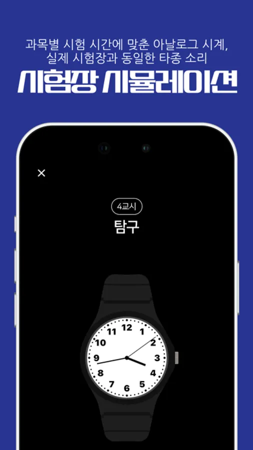 아날로그 시계만 사용할 수 있는 수능 시험장에 대비하기 위해서는, ‘30분 남았네’가 아닌 ‘9시 30분이네’ 라고 연습해야 합니다. 실감을 사용해 실전 모의고사를 연습한다면 언제든지 각 과목에 맞는 아날로그 시계를 보며 연습할 수 있어요.