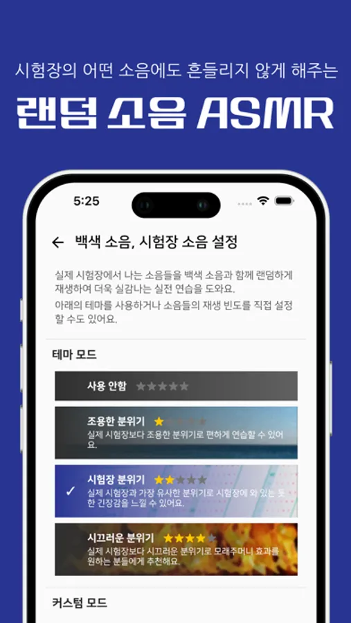 실전 모의고사를 풀 때 백색소음과 함께 무작위로 재생되는 기침 소리, 의자 소리, 한숨 소리 등을 통해 수능 시험장에서 모래주머니 효과를 느낄 수 있어요.