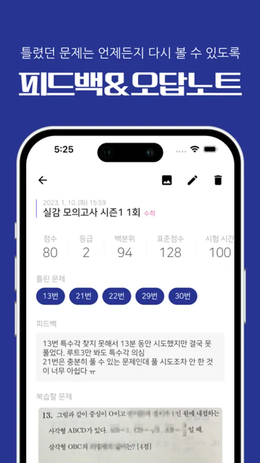 실전 모의고사를 푸는 것만큼 중요한 것은 그것을 기록하고 피드백하는 과정이죠. 실전 모의고사를 응시한 직후 점수, 등급, 틀린 문제와 사진, 피드백 등을 기록할 수 있어요.