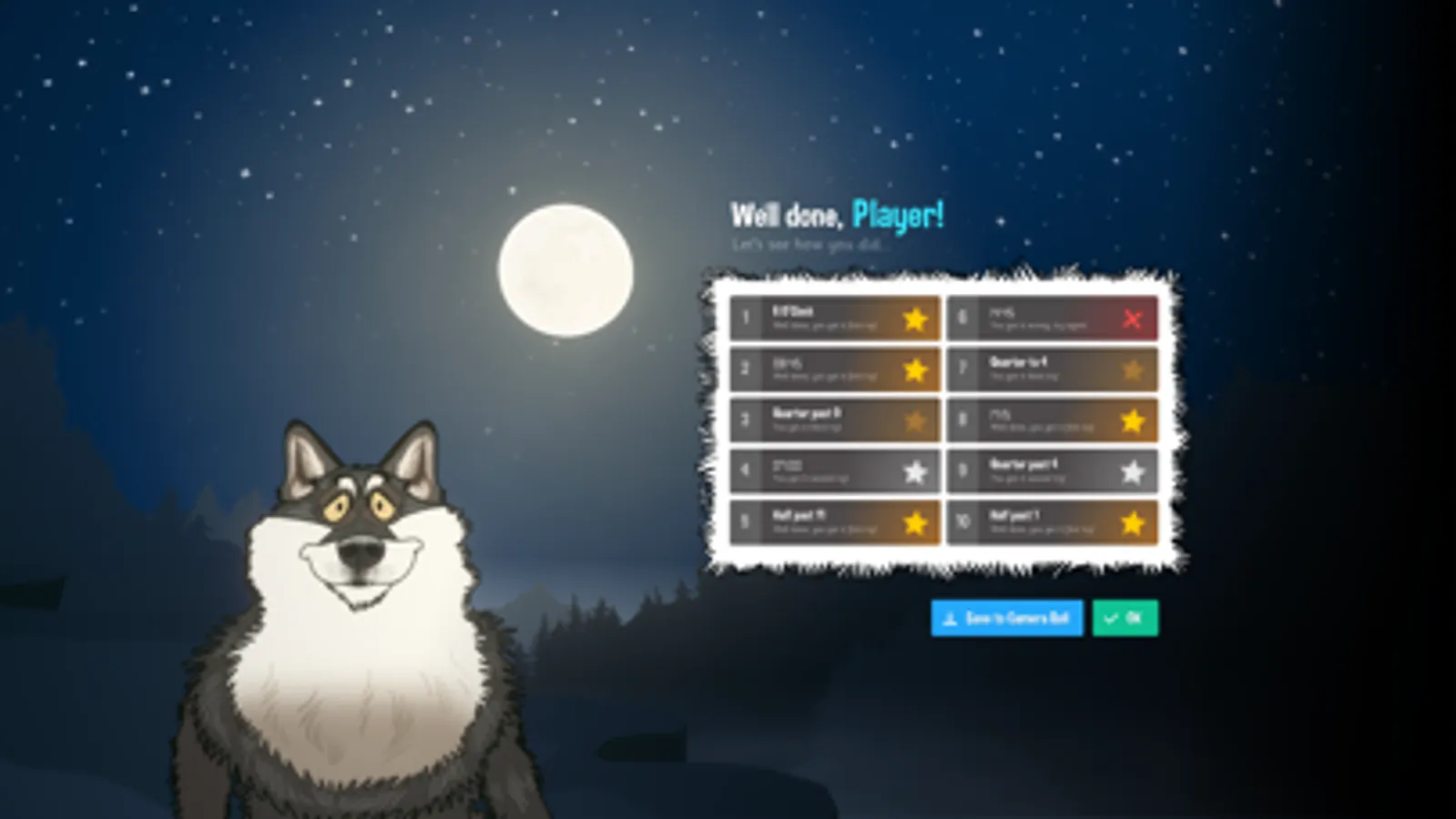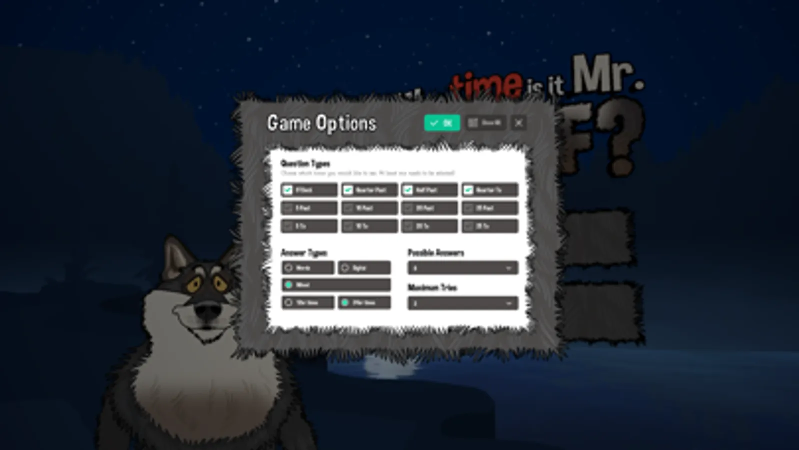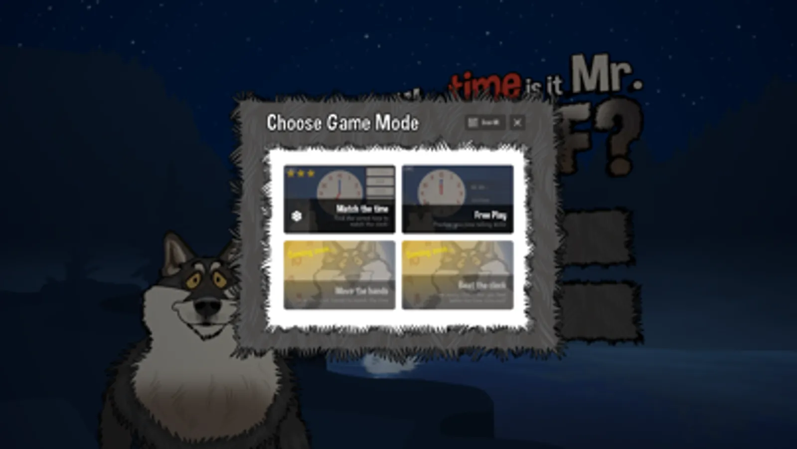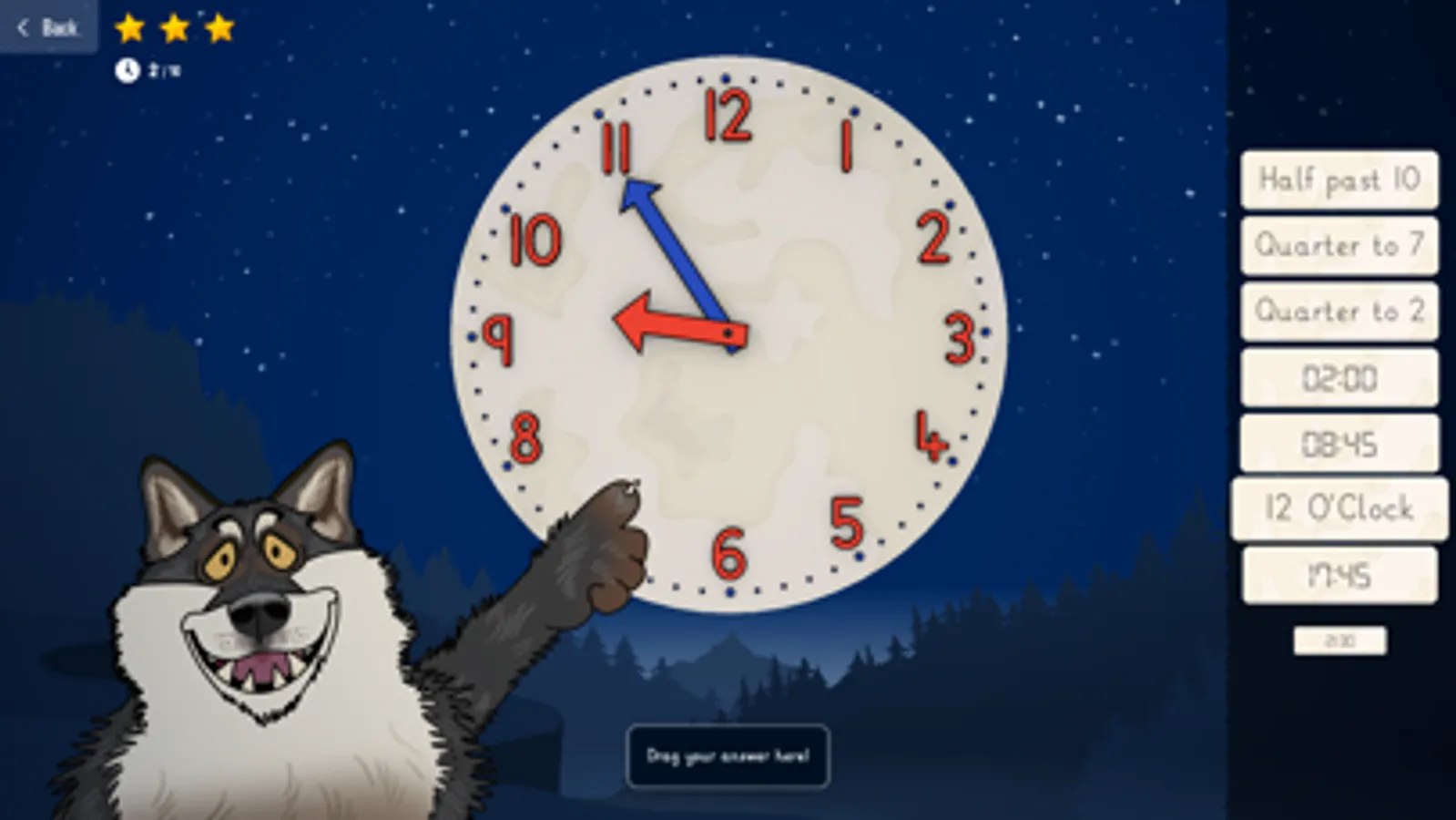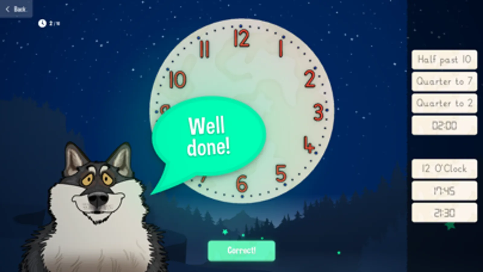 Game Mode 1: Watch as Wilfred the Wolf magically spins the clock on the face of the moon to ten random times and offers the player a choice of up to 8 answers. With simple and intuitive controls, the application is very easy to play and allows the player to concentrate on their time telling practice. Watch out for Dinner Time!!