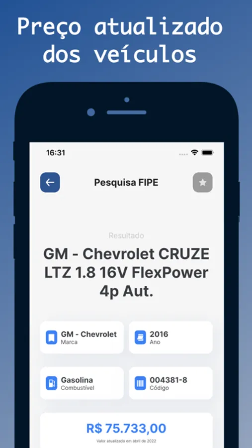 Quando há a pesquisa o resultado mostrado contém: algumas informações que confirma o veículo procurado, como a marca, o ano, o tipo de combustível e um código que é fornecido. Um pouco abaixo a média do valor que o veículo tem.