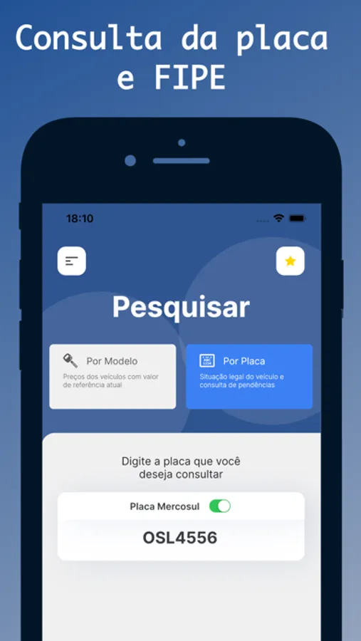 Contém logo na página inicial alguns ícones para ser escolhido qual tipo de veículo está sendo buscado (caminhão, carro ou moto), também tem uma opção depois de ser realizada a pesquisa de favoritar, para em algum outro momento a qual venha ser revisto já ter salvo.