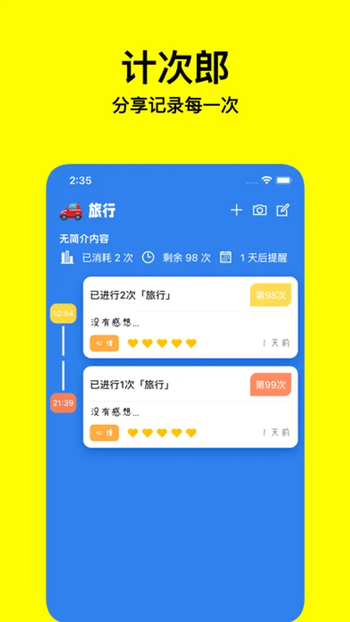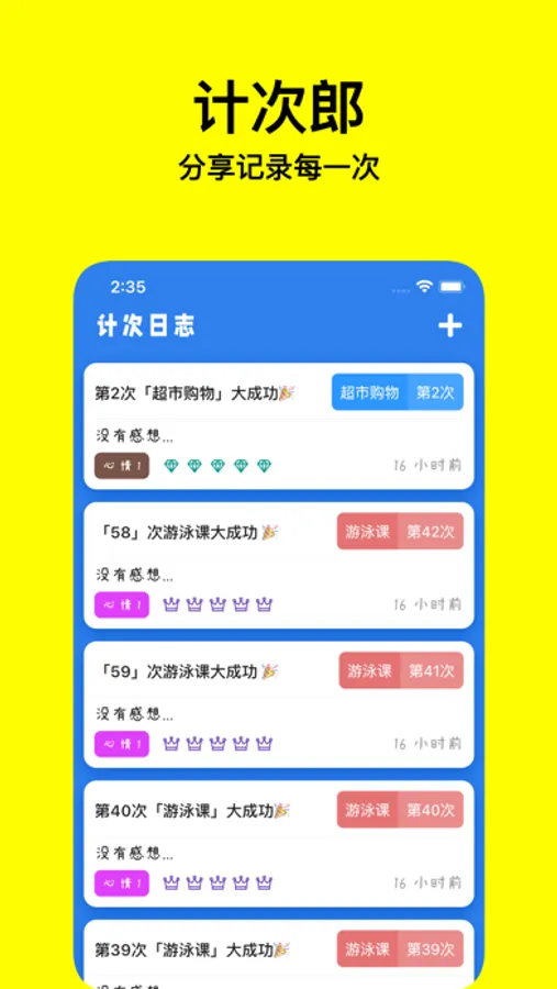 不限量地使用倒计数的方式追踪记录健身、美容次卡使用情况,正向记录喝水、剪发、摸鱼的次数,分类计数。