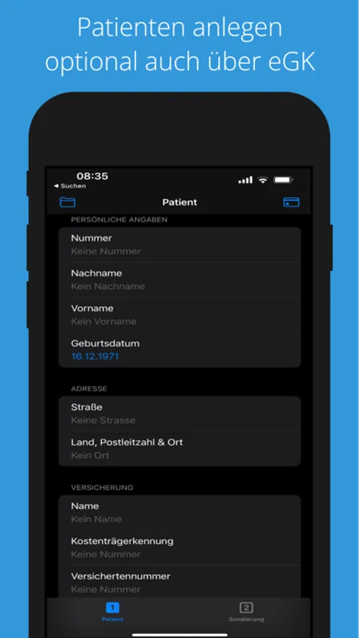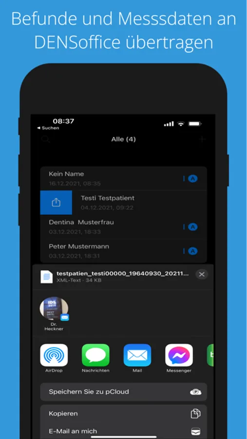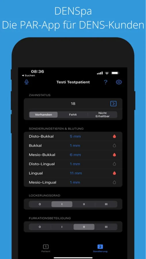 DENSpa hilft Ihnen bei der einfachen und schnellen Erfassung von PA-Befunden (Sondierungstiefen, Blutung, Lockerungsgrad, Furkationsbefall) und deren Übertragung nach DENSoffice. Die Eingabe erfolgt auf Wunsch via lokaler Spracherkennung. Alle Versichertendaten können mit einem Kartenleser direkt von der eGK in die App übertragen werden. Damit ist kein zeitraubendes Abtippen der Versichertennummern mehr nötig.