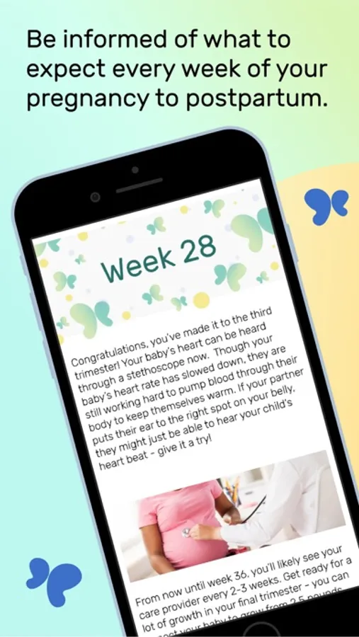 • Week-to-Week Updates: Each week, you’ll receive a new update to help you understand changes to your body and your baby’s development.