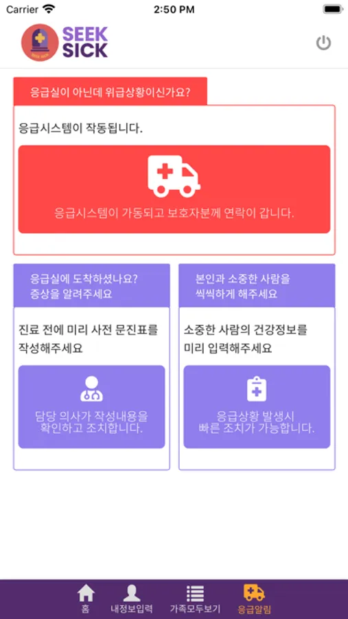 씩씩이는 환자, 보호자 또는 응급실 코디네이터가 환자의 증상을 입력하고, 인공지능에 의해 중증도 및 추정진단을 도출하게 하는 어플리케이션입니다.