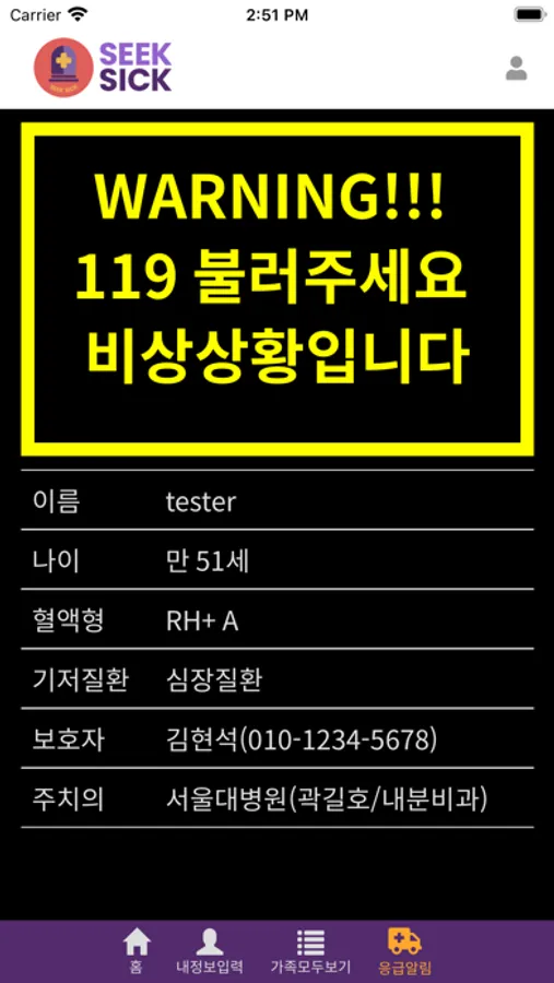 자신에게 응급상황이 발생하였거나 또는 의사표현이 불가능한 상황이 발생했을 때 이 어플을 실행시켜 자신의 상태를 주변 사람에게 보여줄 수 있습니다.