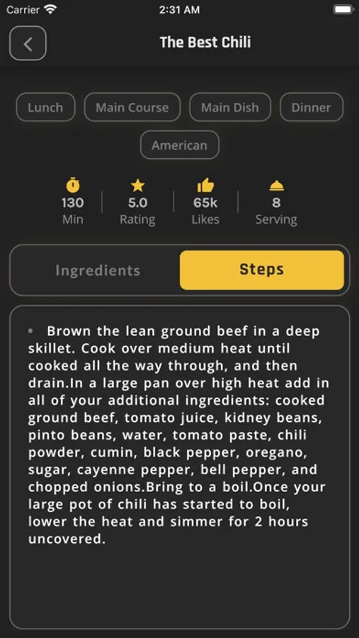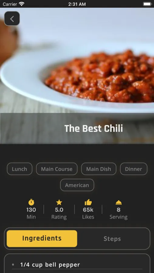 * Detailed information for recipe, such as cooking time, serving persons, rate and likes, ingredients and step by step.