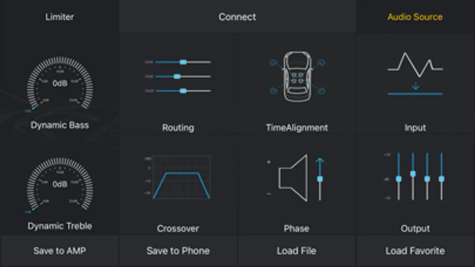 After connecting App to Car Amplifier with Integrated DSP, EQ, BASS, TIME ALIGNMENT, PHASE, MUTE, FILTER , SAVE SOUND SETTING TO PHONE, SAVE SOUND SETTING TO AMPLIFIER, LOAD SOUND SETTING FROM PHONE, RCA OUTPUT etc could be controlled through this App.