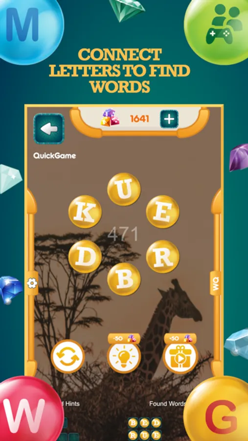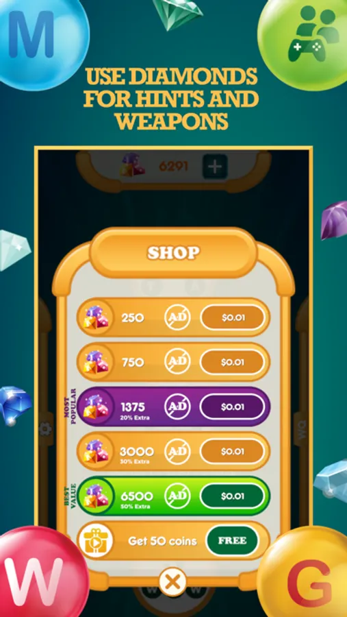 You can buy hints or skip the word by using diamonds. When you make your guess, even if the guess is not correct, if there are letters in the correct place, they will stick and make your next guess easier. You have three chances to guess the word correctly. If you fail to guess the word in three tries, game difficulty decreases. You want to increase the difficulty because with increased difficulty your score will also increase more rapidly.