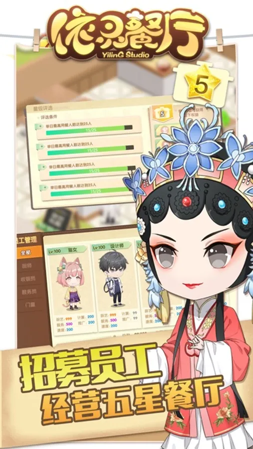 随着餐厅的知名度不断上升,你需要参与餐厅星级评选,评选成功后,将会获得更多高级菜谱和解锁更多的员工,并且会增加客流量。