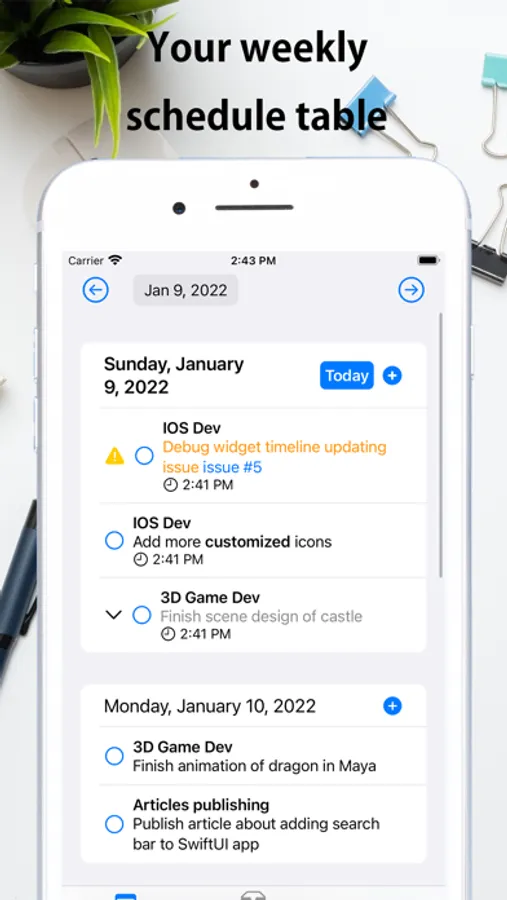 - In the weekly view, the days of one entire week is shown. You can create task for a specific day. This helps you to focus on planning what to do for recent upcoming days.