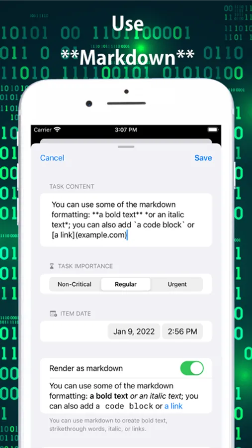 - Use basic markdown formats (bold, italic, links within text, code block)