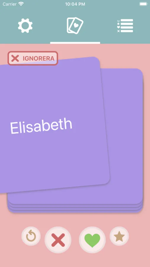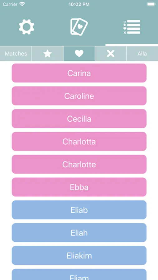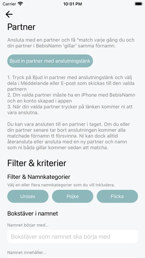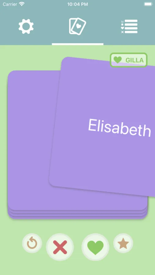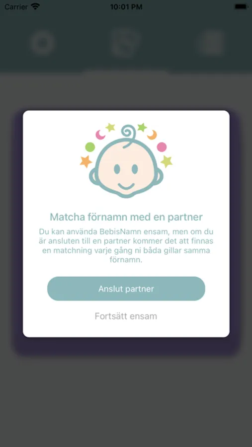 Svep förnamn som du gillar till höger och ignorera namn som du inte gillar genom att svepa dem åt vänster. Om du är ansluten till en partner*, kommer det att finnas en matchning när både du och din partner har gillat samma förnamn.