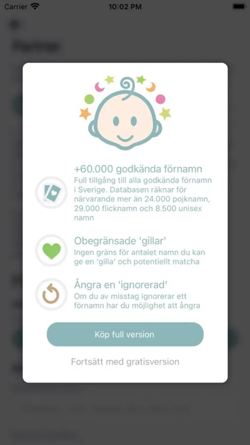 * Notera! Fullversionsköp med tillgång till alla godkända förnamn i Sverige gäller för EN användare. Om du vill matcha förnamn med din partner bör du vara medveten om att ni båda måste köpa den fulla versionen. BebisNamn är för närvarande endast tillgängligt för iPhone.