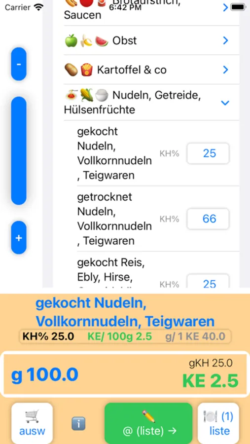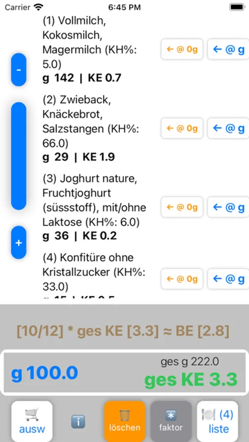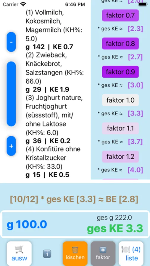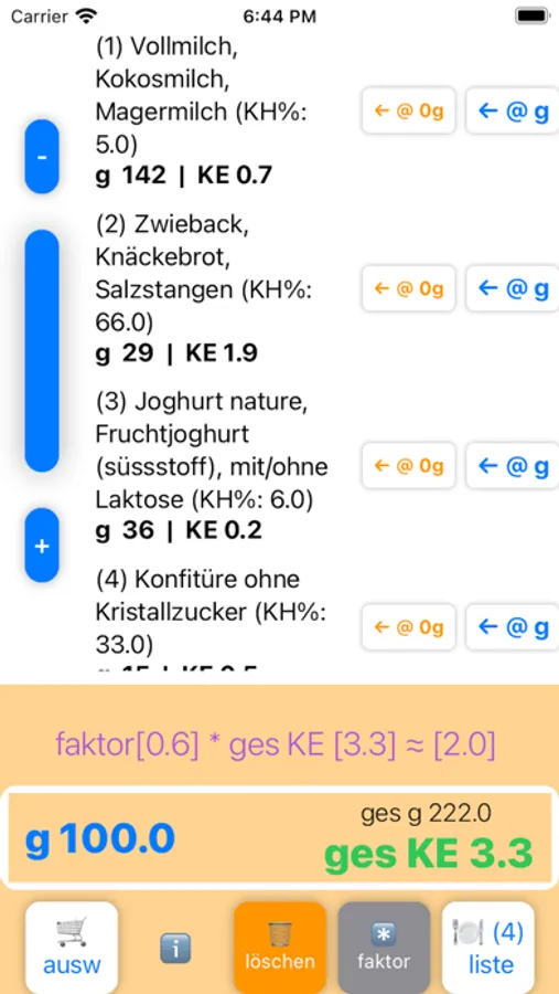 Einfache Lebensmittelliste mit Anzeige der KH% (g KH / 100g). Einstellen der g Zahl über scroll bar und/oder +/- Tasten. Merken, Addieren, Kontrollieren, ggf. anpassen.