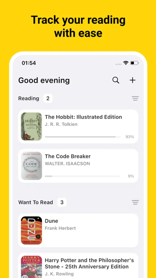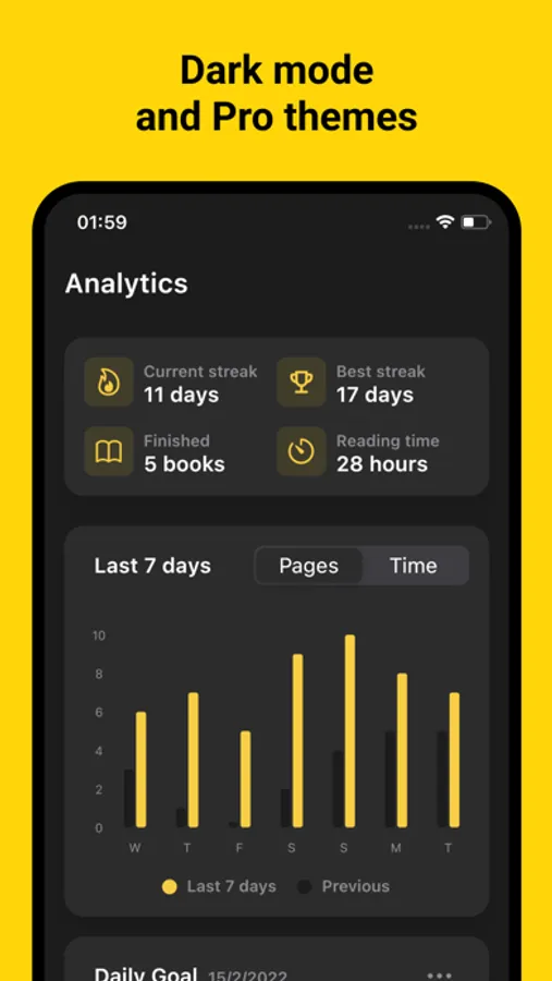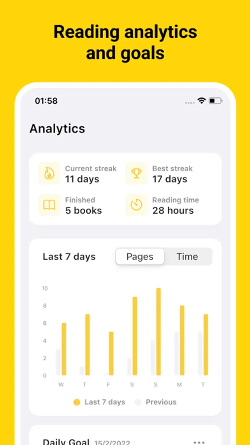 Set daily and yearly reading goals. See your reading streak (days in a row reading)
