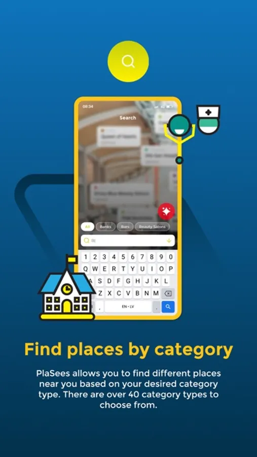 PlaSees allows you to find different places near you based on your desired category type. There are over 40 category types to choose from.