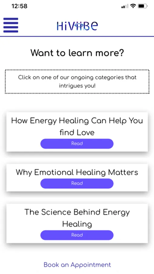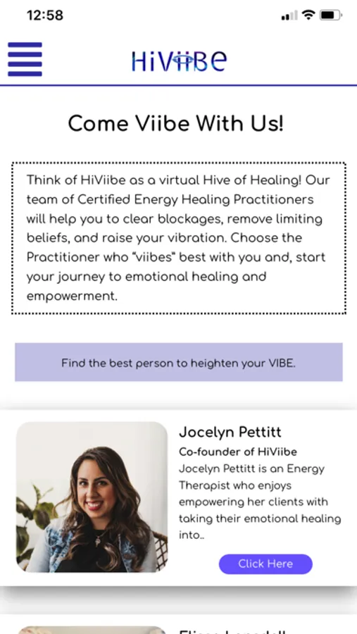 Your healing place - in your pocket! HiViibe gives you instant access to a community of high vibrational, specially certified Emotion Code/Body Code practitioners. Book one on one with the practitioner you “viibe” best with! Join us for one (or many) of our weekly group energy healing sessions. Stay in the know with special articles and events. Clear your heart wall and join fellow “Heart Wall Warriors” Join the HiViibe Tribe and meet your vibrational match feature - coming soon!