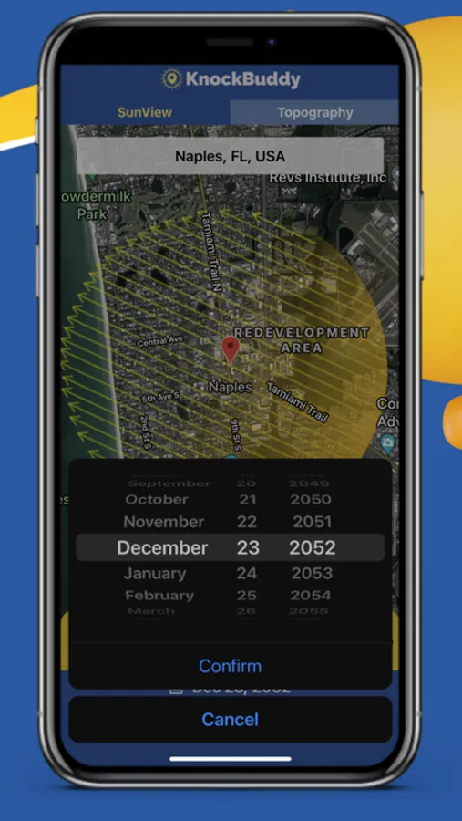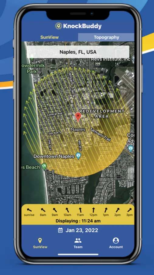 Map settings in satellite SunView or in Topography; Use the display to predict and see an area's exposure by direction of the sun using the Sun's Locations, Solar Path, and Geographic locating Knockbuddy is able to show you what direction Sun rays hit a location.