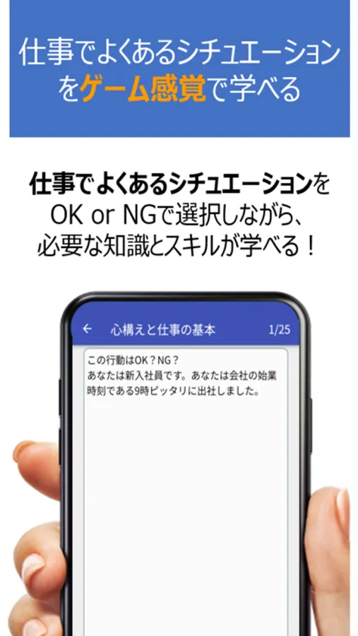 できる新入社員・若手社員が身に付けているスキルや知識を、仕事でよくあるシチュエーションに沿って実践的に学べるアプリです。