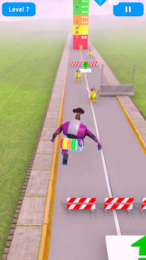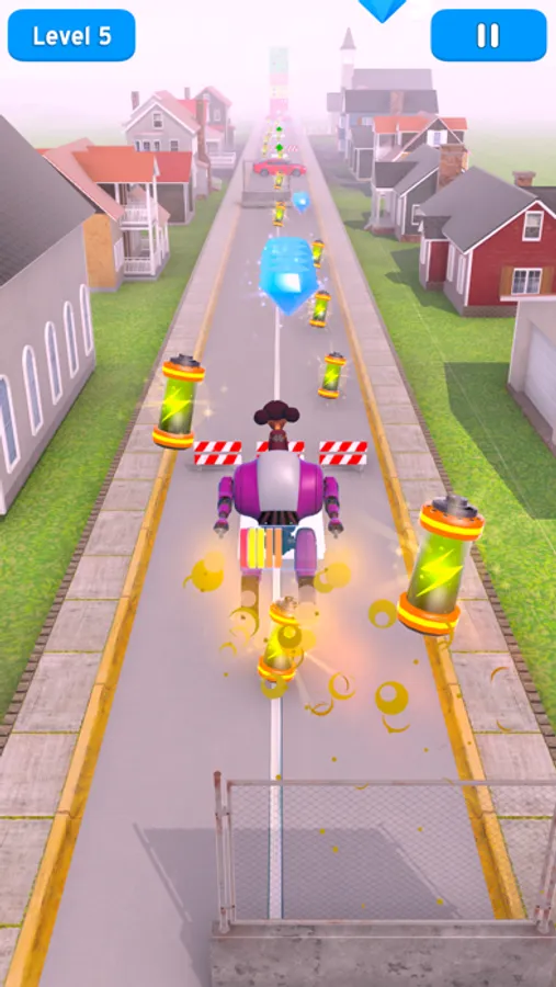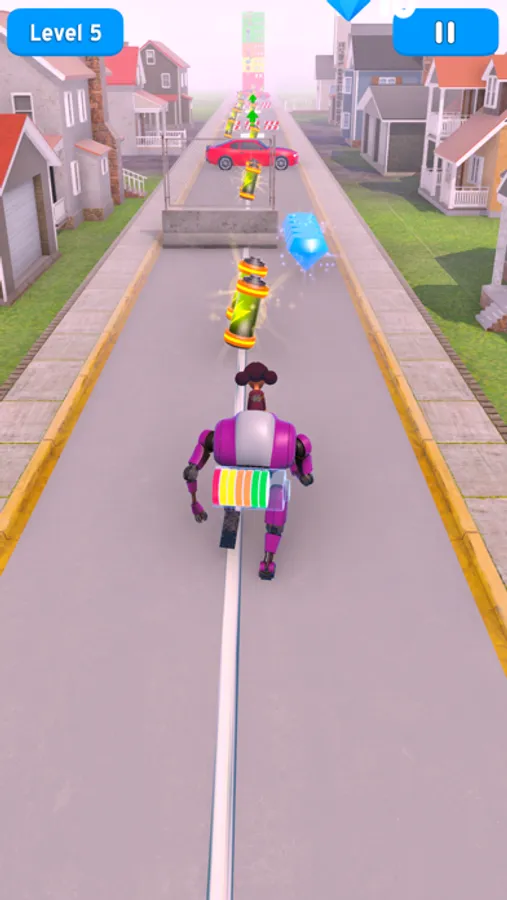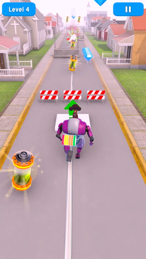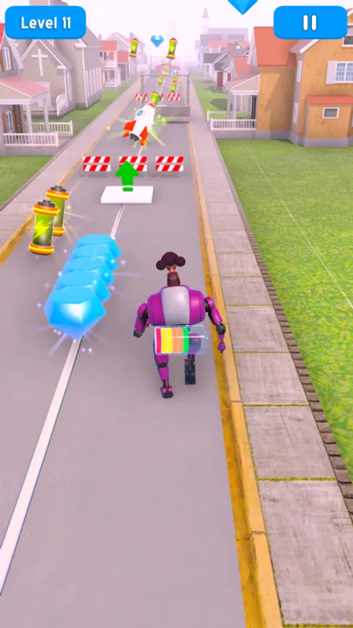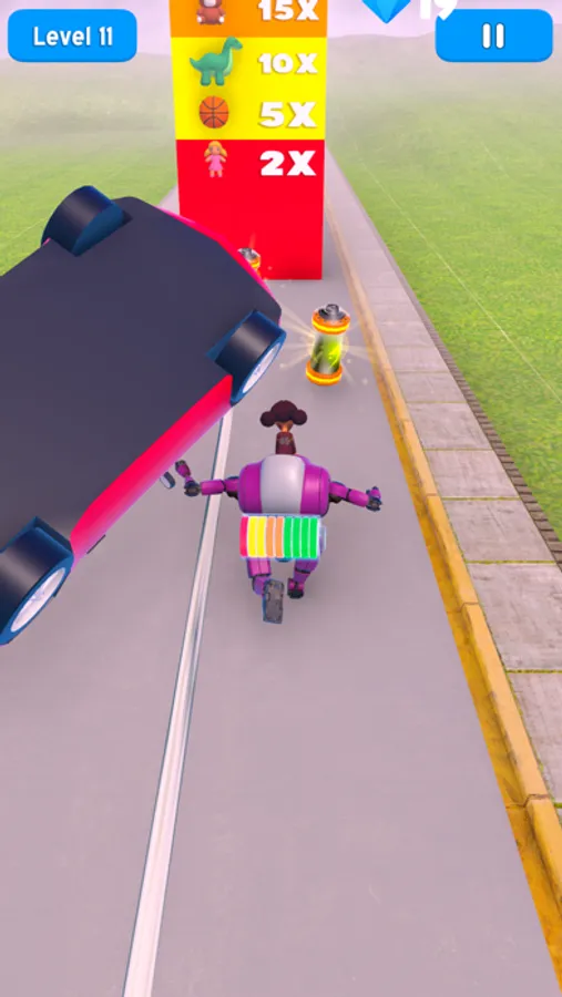 Run the giant robot, demolish anything in your way. Jump, fly, and raise your kid to the sky! All these action will require a lot of power, and when your charge goes low, the robot will slow down and eventually power off, killing all the fun. Make sure to pick up batteries to have enough juice in your robot.