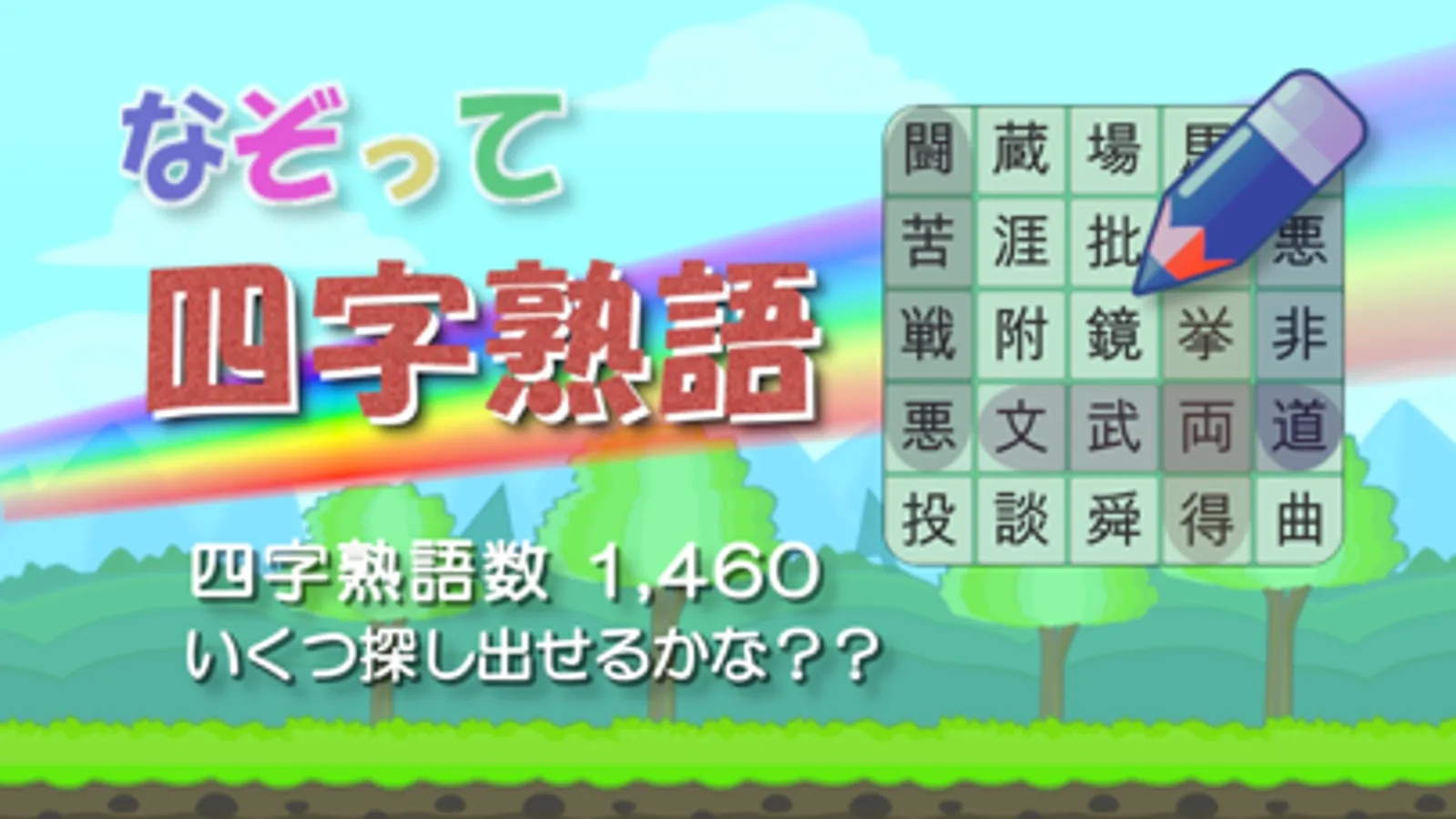 四字熟語暗記完全無料アプリ。ちりばめられた漢字の盤面から、指定された四字熟語をなぞって探し出すパズルゲーム(ワードサーチ)です。